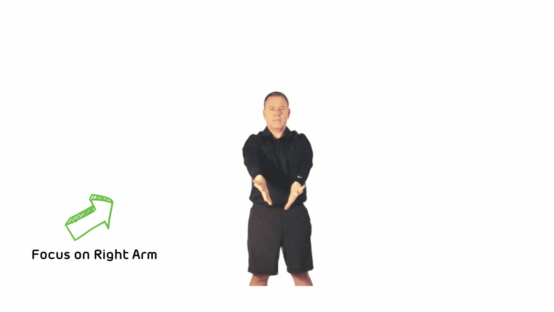 Bring right arm up behind body and overhead rotating palm out and thumb back